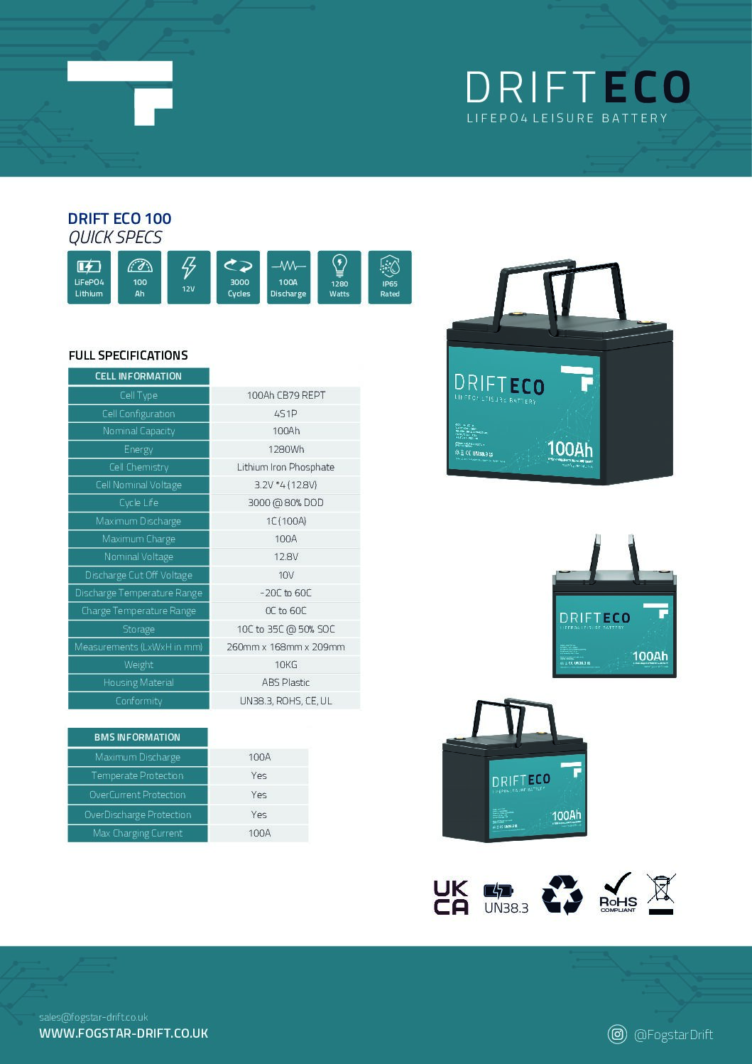 With a superb 100Ah capacity and 1250Wh of usable energy, the Drift ECO is perfect for powering everything from leisure applications like camping and caravanning to professional use cases like solar energy storage.